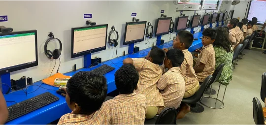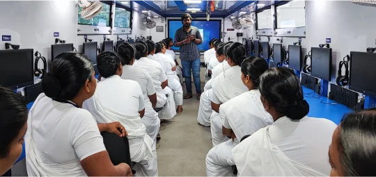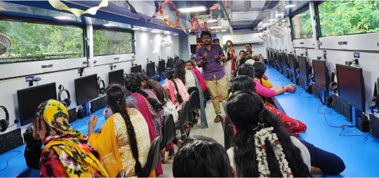 Redington Foundation’s investment in digital infrastructure and literacy amongst rural communities unlock enormous potential for socio-economic progress. To minimize the rural vs urban digital divide and empower access, the Foundation partnered with Learning Links Foundation to implement the HP World on Wheels programme in Virudhunagar district of Tamil Nadu state. Our solar powered mobile digital lab travels to remote schools. It offers digital literacy programs that help students and communities with computer skills, safe internet practices, and builds confidence to access digital tools.